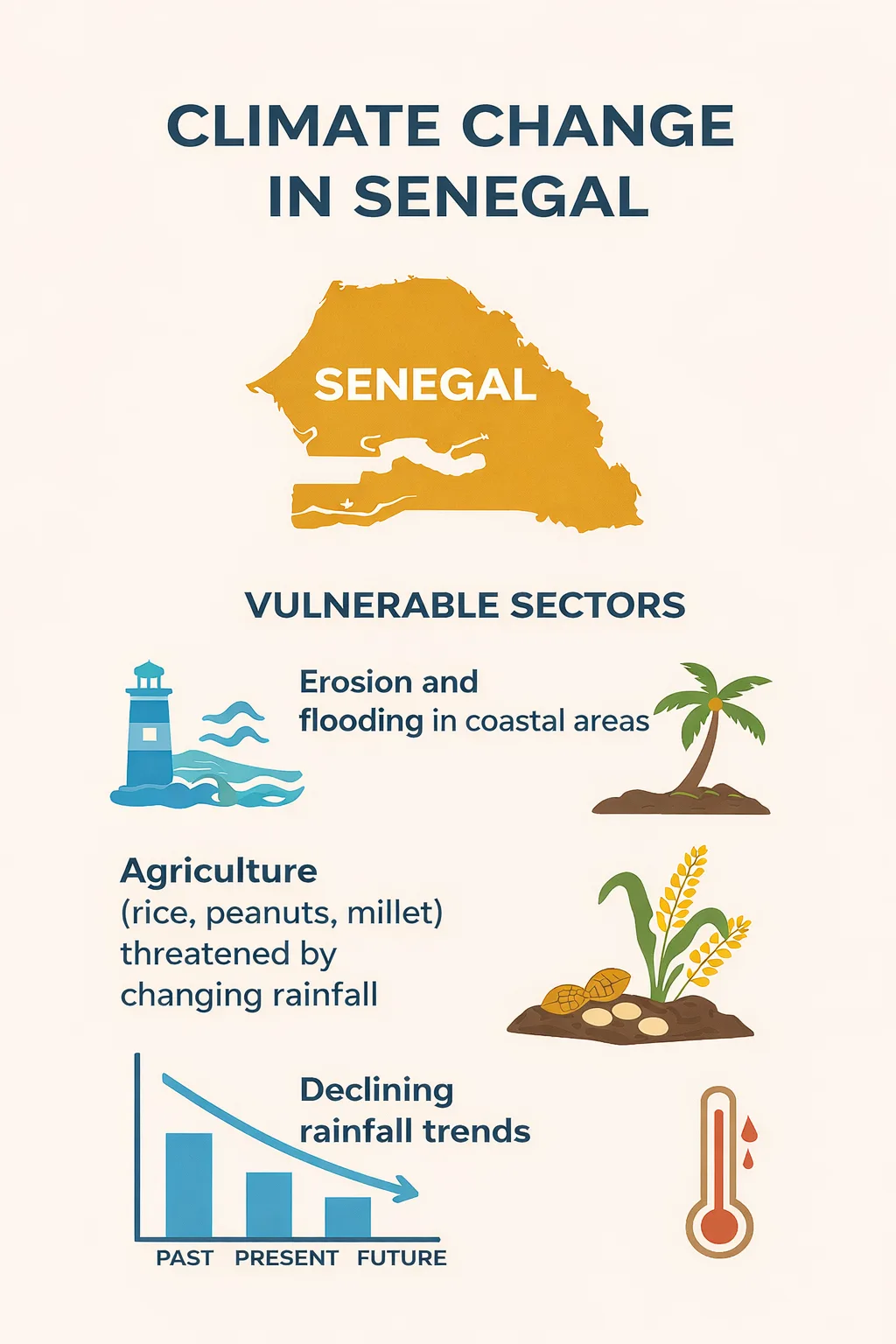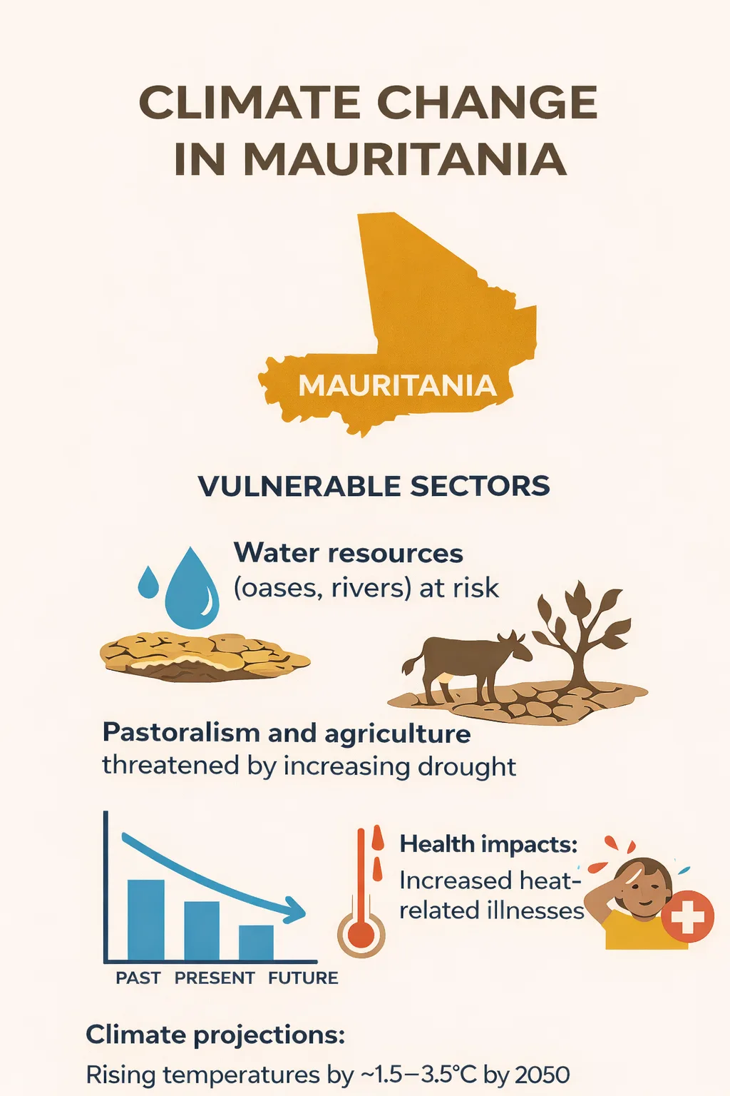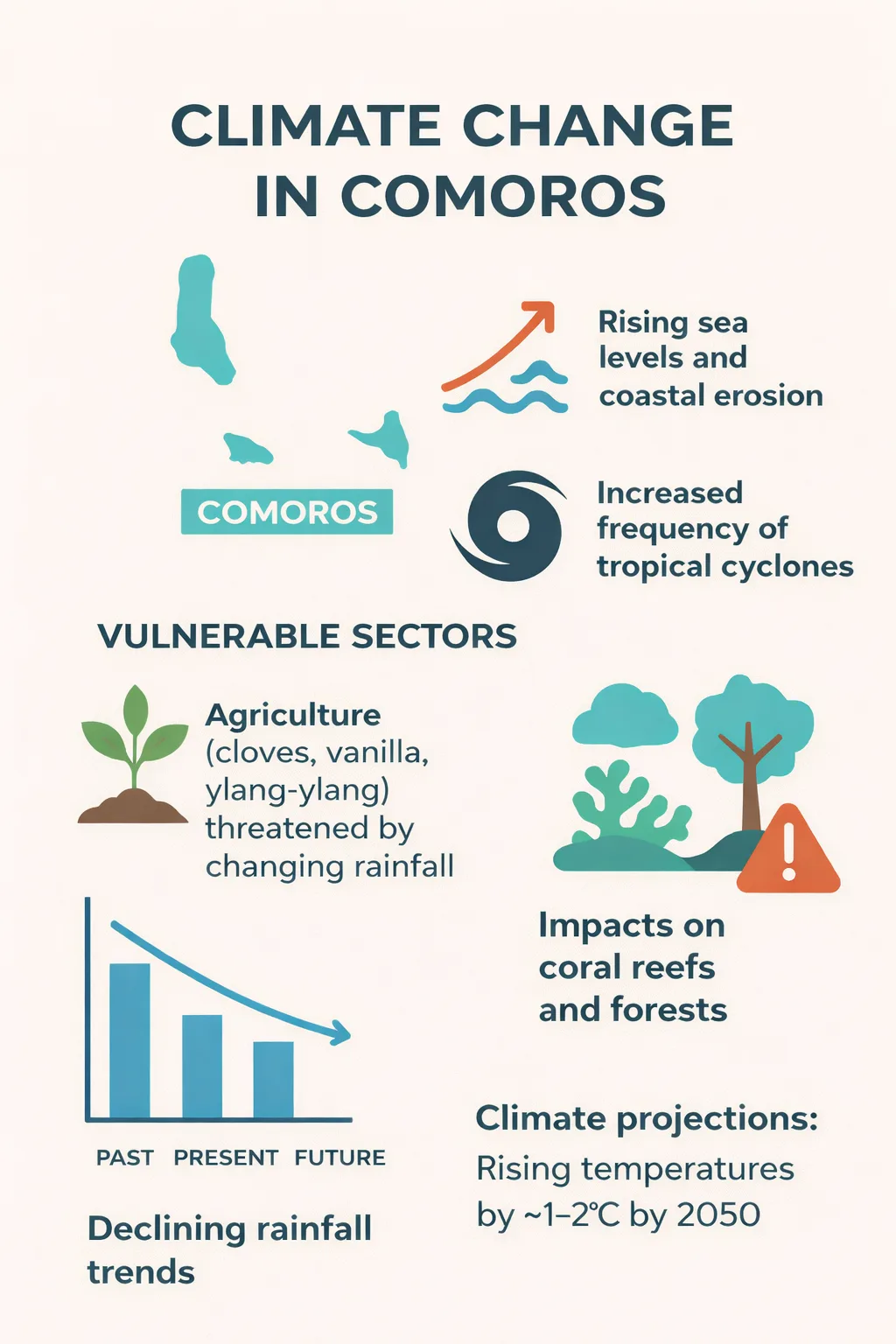 Across Mauritania, Senegal and Comoros, climate change is already reshaping daily life. In Mauritania and Senegal, desertification and erratic rainfall threaten agriculture and food systems. In Comoros, rising seas and stronger storms are affecting coastal communities and farmland.